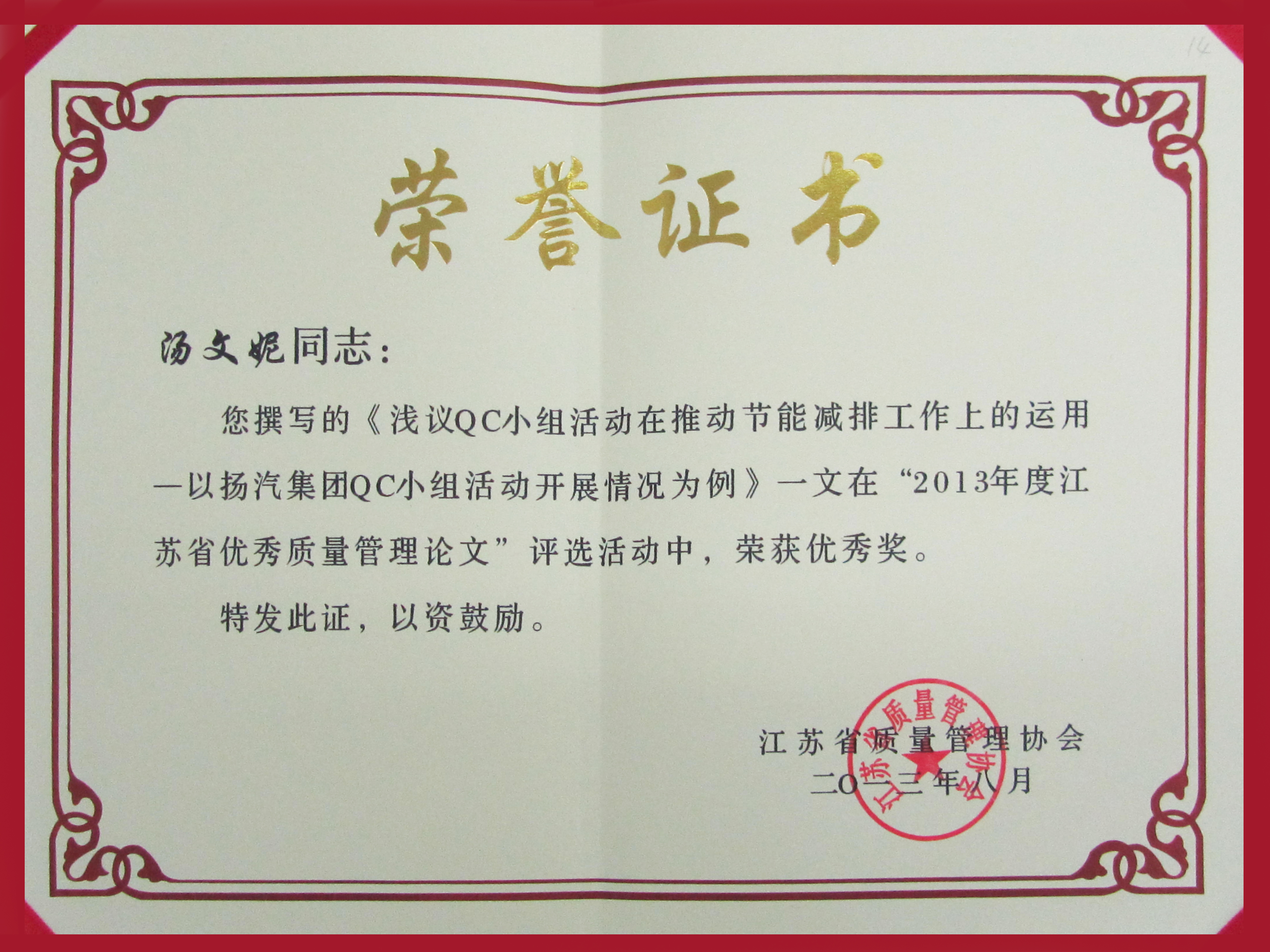 此外,集團公司企業(yè)文化策劃處湯文妮的參賽論文《淺議QC小組活動在推動節(jié)能減排工作上的運用——以揚汽集團QC小組活動開展情況為例》在“2013年度江蘇省優(yōu)秀質量管理論文”評選活動中榮獲優(yōu)秀獎。