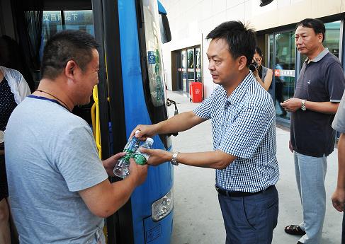 在西部客運樞紐停車場,凌董事長與職工們親切交談,詢問他們的工作狀態(tài)和身體狀況,并送上礦泉水和八寶粥。董事長熱忱表示,企業(yè)發(fā)展離不開一線工作人員的辛勤勞動,連續(xù)的高溫天氣給道路運輸增加了很大壓力,一線職工戰(zhàn)高溫、斗酷暑,非常辛苦,為企業(yè)做出了很大貢獻。他希望廣大職工繼續(xù)發(fā)揚艱苦奮斗的精神,確保車輛安全出行和準點發(fā)車,確保旅客平安往返。