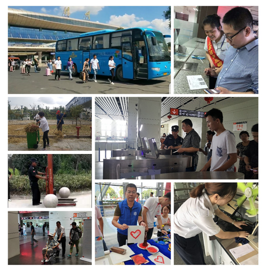 車站各班組分工協(xié)作打掃各自責任區(qū)域,清掃工作臺、參加"志愿服務 美好你我他"第三屆江蘇志愿服務展示交流活動、清掃路邊綠化帶、噴灑藥水、除雜草滅蟲害、整理通道入口、設備設施維護、消防安全檢查、身份實名驗證、檢查危險禁運物品、檢查客車安全帶、為特殊旅客提供一站式服務、熱情引導購票、候車,征詢旅客意見、開展問卷調(diào)查,以整潔的站區(qū)環(huán)境、良好的精神風貌和優(yōu)質(zhì)的候乘服務當好東道主,文明迎盛會。