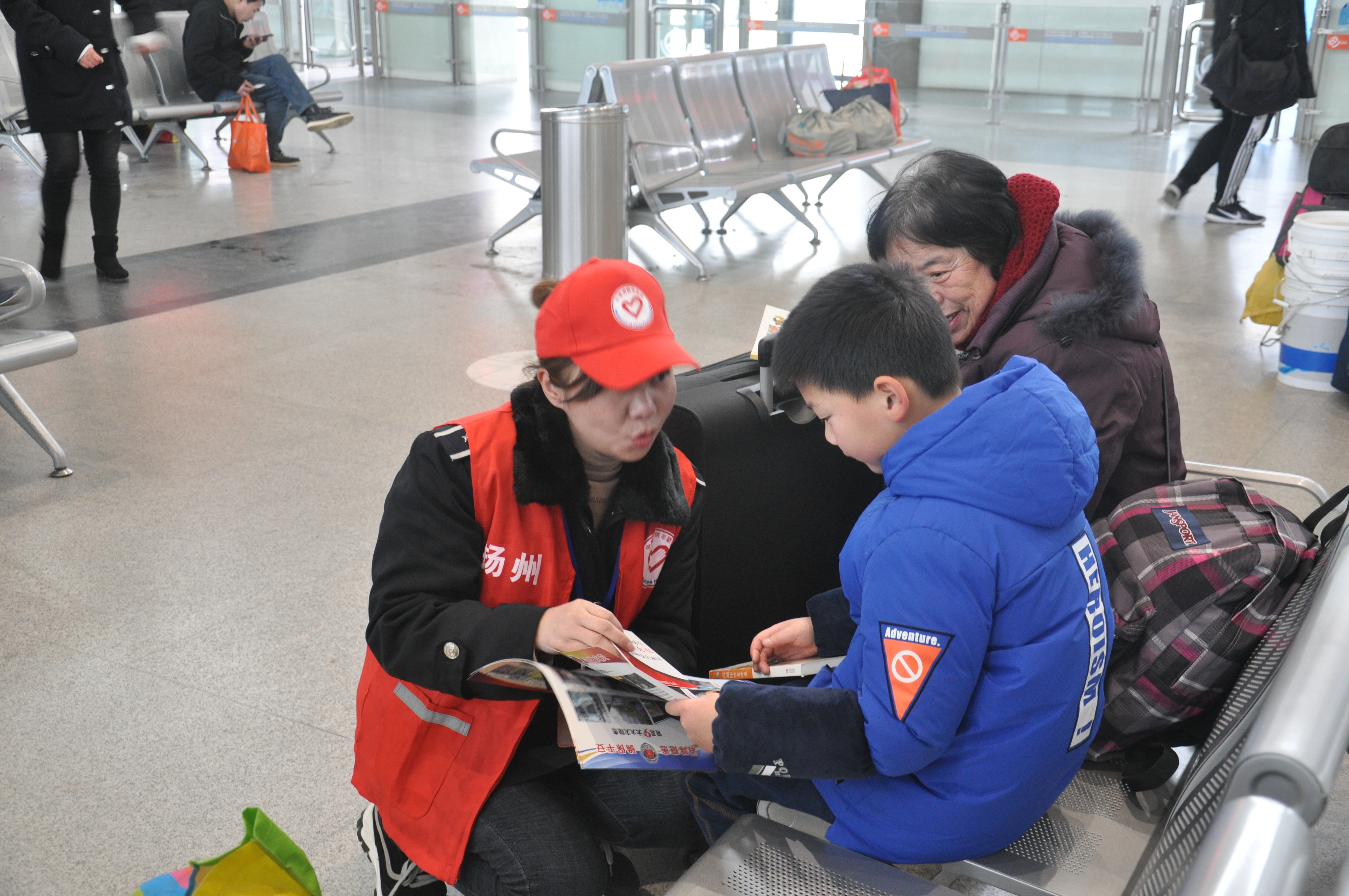 活動現(xiàn)場提供了種類繁多的書籍和春聯(lián),旅客們在宣傳臺前駐足,為孩子、親人或自己精心挑選,氣氛熱烈。活動現(xiàn)場還安排了揚(yáng)汽集團(tuán)志愿者向來往旅客進(jìn)行消防安全知識的宣傳和講解。