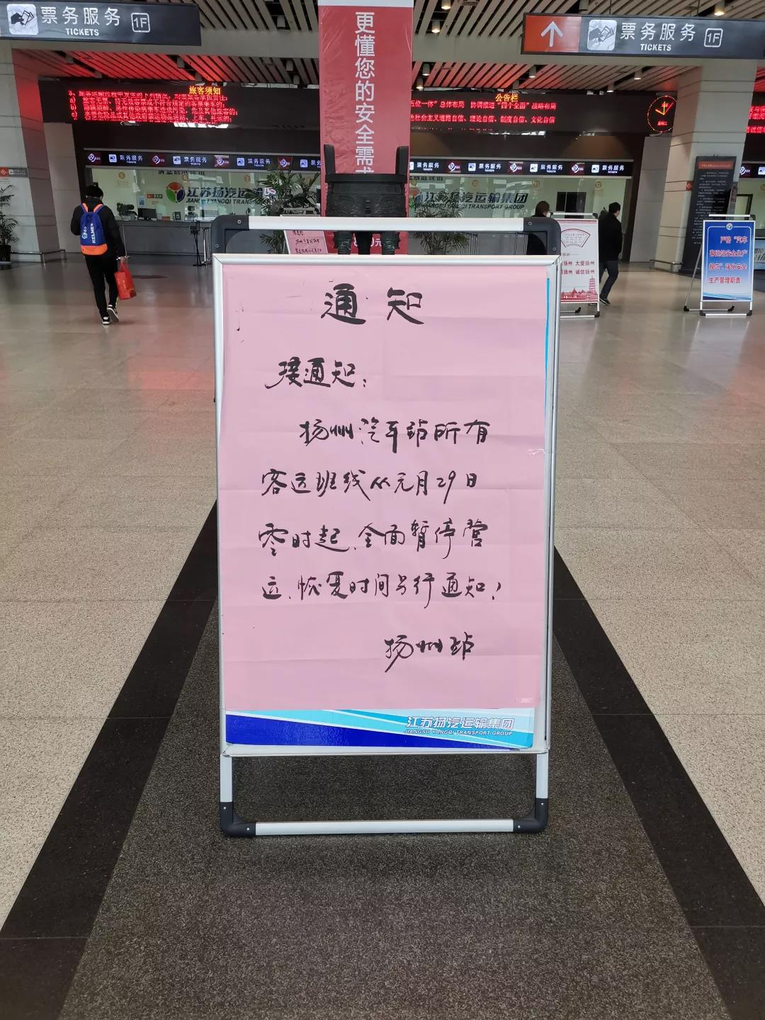 為進一步配合我市做好新型冠狀病毒感染的肺炎疫情防控工作,遏制疫情通過交通渠道擴散傳播,揚汽集團根據(jù)揚州疫情防控工作需要,決定從2020年1月29日0時起,暫停揚州汽車站、揚州汽車東站及江都汽車客運站的運營,停發(fā)所有客車班線,暫停所有包車客運業(yè)務。