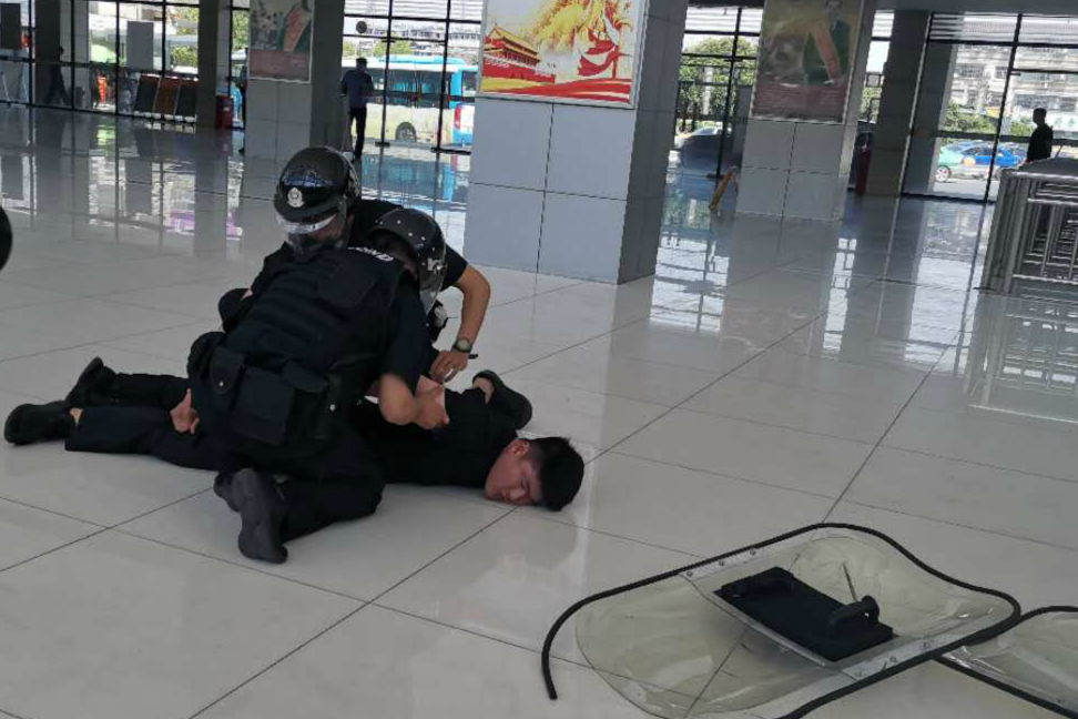 本次演練主要針對人員密集場所犯罪分子持刀砍殺旅客的警情進(jìn)行模擬。一名“黑衣男子”因生活受挫報(bào)復(fù)社會(huì),在江都客運(yùn)站售票大廳內(nèi)持刀砍殺旅客。車站工作人員立即疏散旅客,利用110聯(lián)動(dòng)中心緊急聯(lián)系警方。當(dāng)接到報(bào)警后,110指揮中心立即發(fā)出指令,要求江都區(qū)特警大隊(duì)、刑警大隊(duì)、交警大隊(duì)以及新區(qū)派出所人員攜帶裝備迅速趕到客運(yùn)站展開抓捕工作。警方將“嫌疑人”有效隔離后,迅速利用盾牌、鋼叉、抓捕器等防護(hù)武器將其制服。