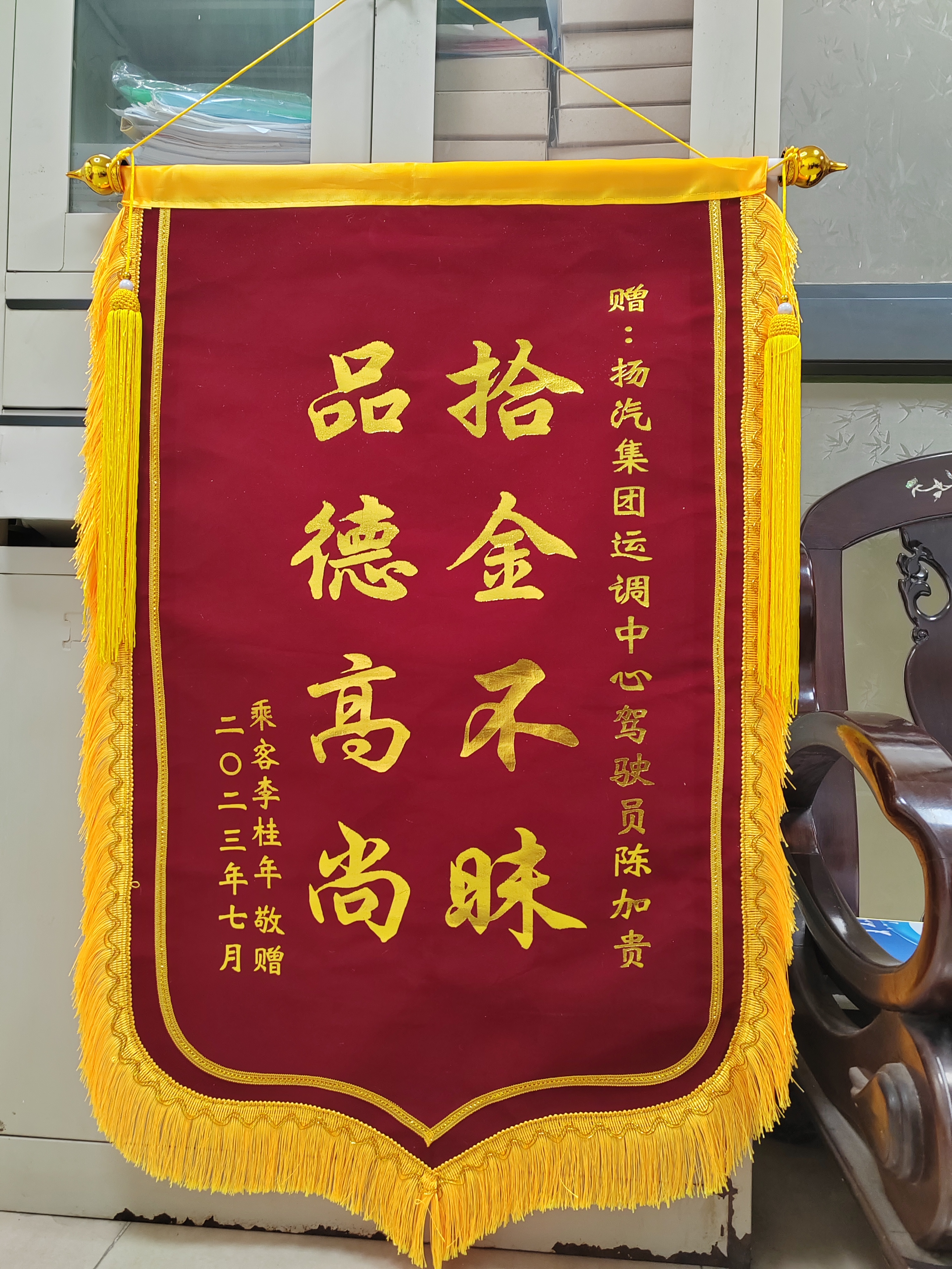 近日,江都汽車站收到了外地寄來(lái)的一面印有“拾金不昧 品德高尚”的錦旗交到了分公司相關(guān)負(fù)責(zé)人的手上,以此來(lái)表達(dá)對(duì)駕駛員陳加貴師傅拾金不昧行為的感謝。