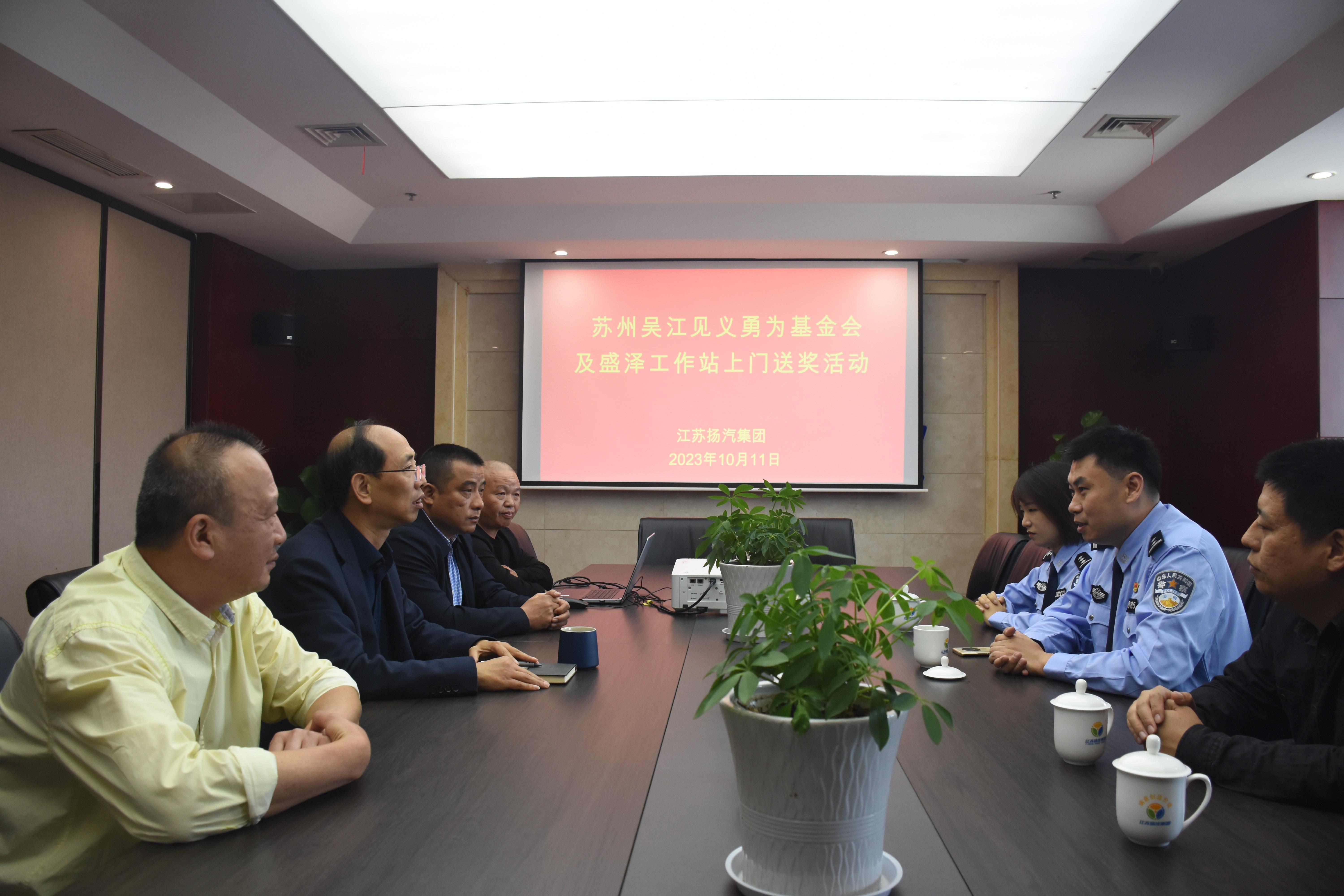 10月11日,蘇州市吳江區(qū)見義勇為基金會(huì)及盛澤工作站一行來到揚(yáng)汽集團(tuán),為勇救突發(fā)心臟病乘客的大巴車司機(jī)郭安鳳上門送獎(jiǎng),表彰他見義勇為的感人事跡。