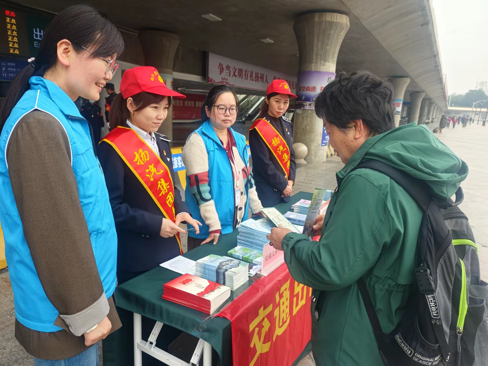 活動現(xiàn)場,志愿者們有序為旅客提供問詢指引、維持秩序、文明勸導等志愿服務,熱情為旅客們介紹揚州的美景、美食以及旅游線路的規(guī)劃,用熱情的服務態(tài)度和專業(yè)知識,給旅客們帶來了更好地幫助。